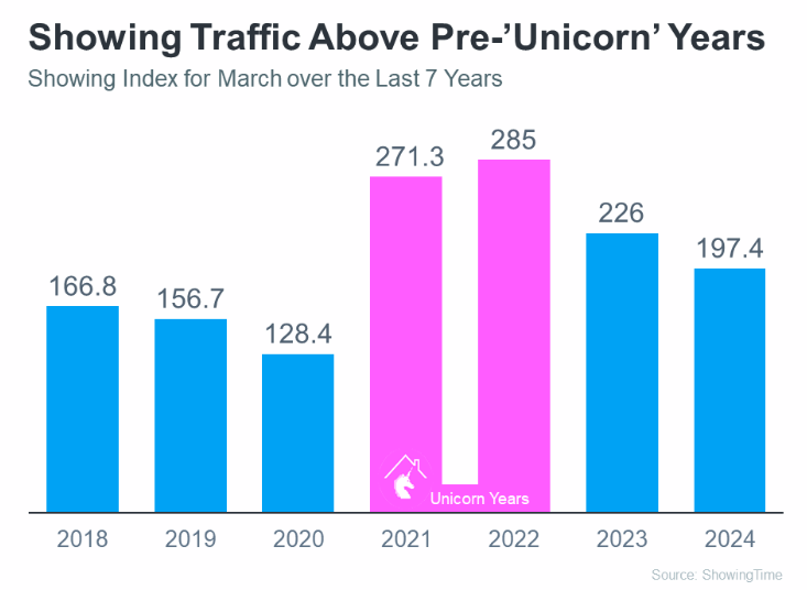 You can see demand has dipped some since the ‘unicorn’ years (shown in pink). That’s in response to a lot of market factors, like higher mortgage rates, rising prices, and limited inventory. But, to really understand today’s demand, you have to compare where we are now with the last normal years in the market (2018-2019) – not the abnormal ‘unicorn’ years.